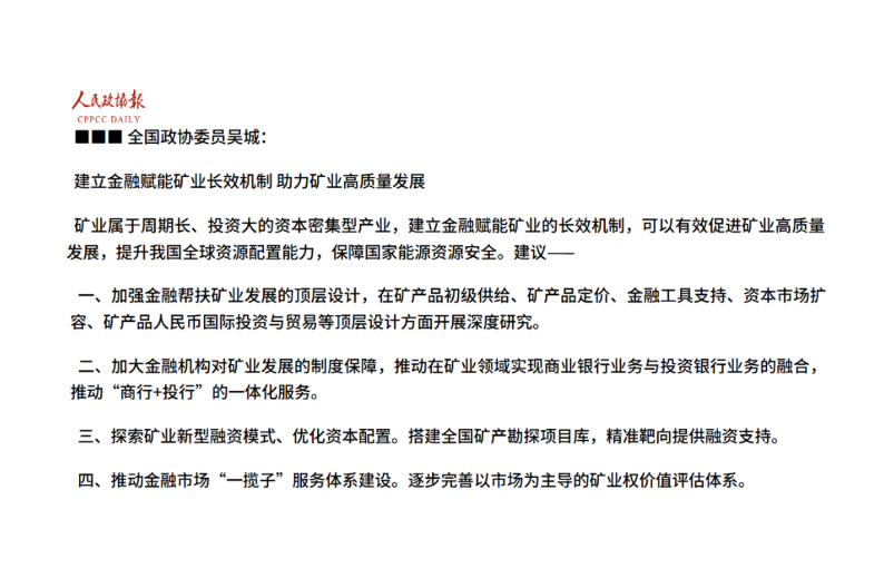 全國政協委員吳城:建立金融賦能礦業長效機制 助力礦業高質量發展